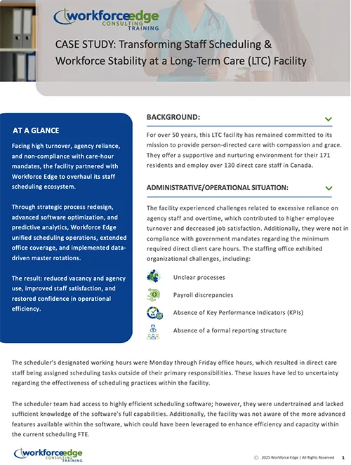 Healthcare Scheduling Case StudiesWorkforce Edge case studies on healthcare workforce scheduling, strategy, optimization and more. CASE STUDIES Reengineering Health System Scheduling: A Case Study on Cost Savings and Enhanced Employee Satisfaction DOWNLOAD Reengineering Workforce Scheduling: A Success Story in Boosting Efficiency & Staff Satisfaction for a Large Health System DOWNLOAD How to Increase Full-Time Positions in Long-Term Care: A Success Story DOWNLOAD Transforming Staff Scheduling & Workforce Stability at a Long-Term Care Facility DOWNLOAD Contact Workforce Edge to schedule a consultation. Full Name: Email: Phone: Subject: Message: How did you hear about Workforce Edge? ColleagueConferenceSearch EngineLinkedInEmail Please leave this field empty. Please leave this field empty. Please leave this field empty.